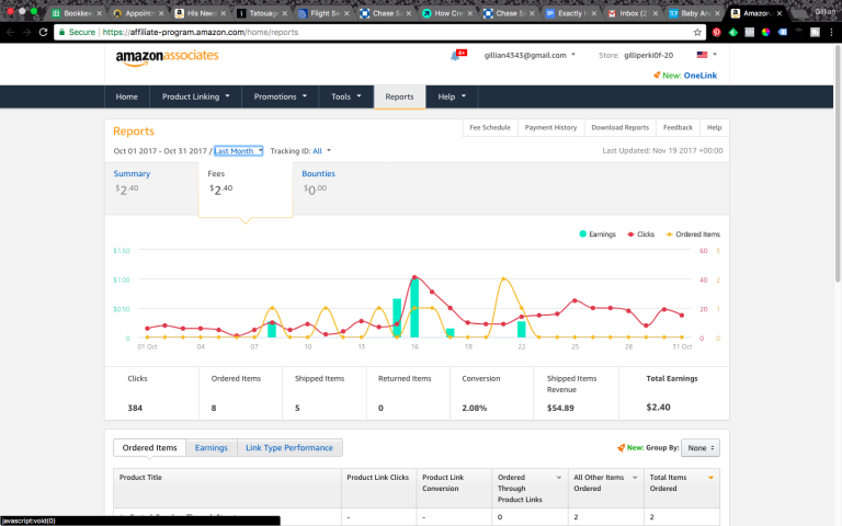 Since I’m barely promoting my book at all anymore, I don’t get much from Amazon affiliates, and what I do get varies wildly from one month to the next. In October I earned a whopping $2.40. 😛