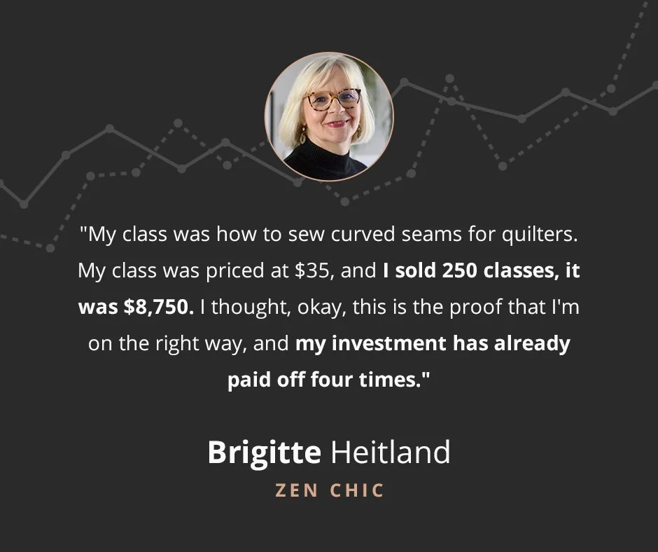 “My class was how to sew curved seams for quilters. My class was priced at $35, and I sold 250 classes, it was $8,750. I thought, okay, this is the proof that I'm on the right way, and my investment has already paid off four times.”